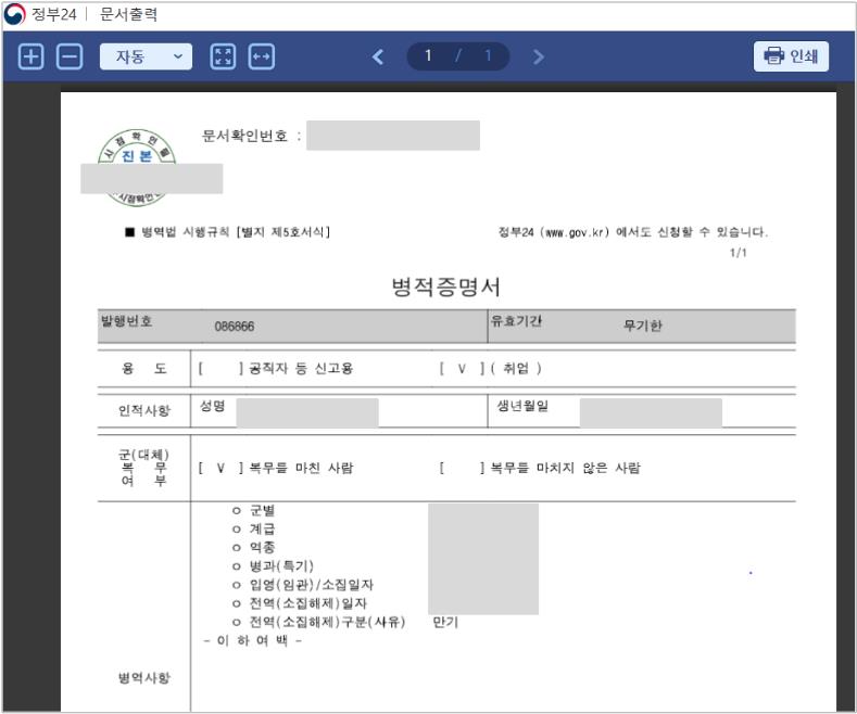 7. 이제 병적증명서를 인쇄 및 PDF파일로 저장할 수 있습니다.