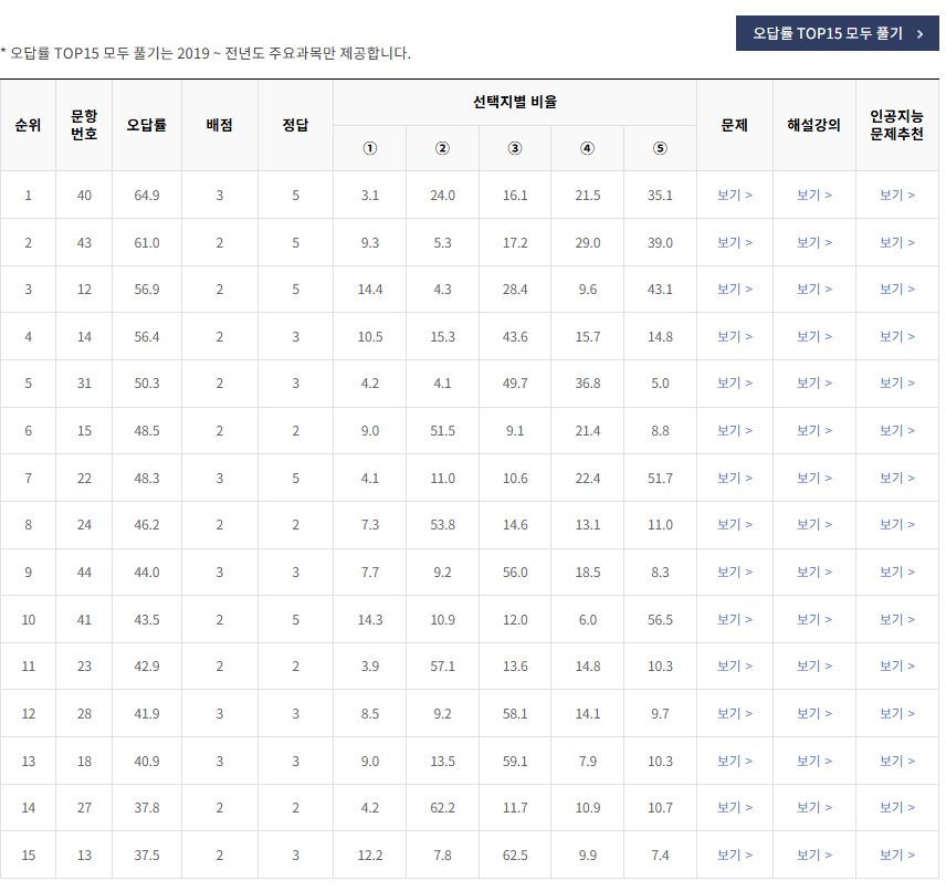 틀린 문제의 유형을 파악하고 다음 시험을 대비하시길 바랍니다. 오답률 Top 15문항을 아래 표로 알려드리겠습니다.